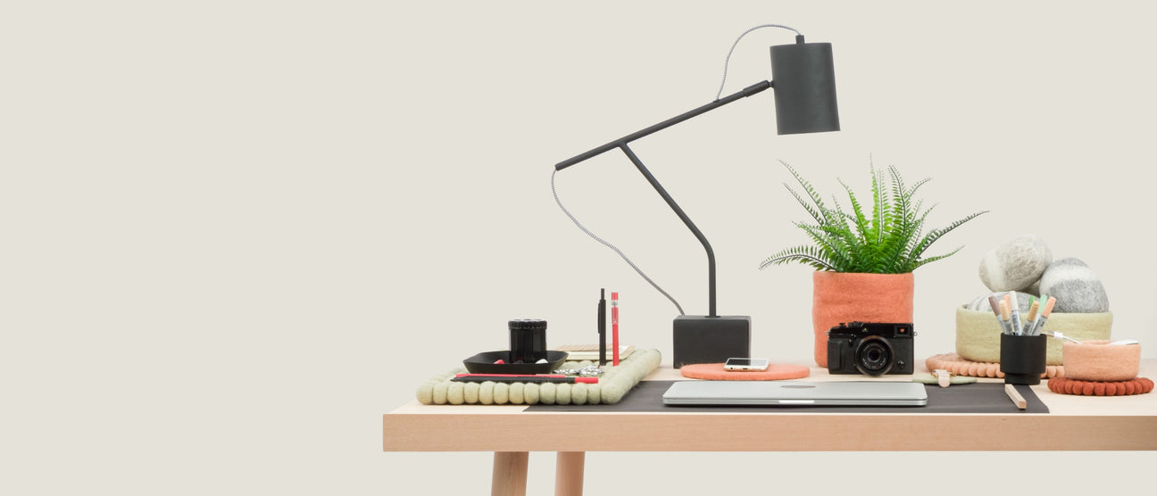 Un lugar de trabajo agradable y ordenado favorece la concentración. Porque en un ambiente ordenado se puede trabajar de forma más eficaz y agradable. Las cestas de fieltro y los posavasos de myfelt sirven como pequeñas ayudas organizativas. Su estructura robusta y suave confieren al estudio una atmósfera especial. Los cestos de fieltro en diferentes tamaños y colores no sólo crean orden en el escritorio, sino que también quedan bien en aparadores, estanterías y mesas auxiliares. Móviles, auriculares, bolígrafos y otros materiales de trabajo están a mano en los posavasos.