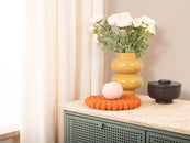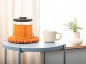 El salvamanteles Afra en el color naranja combina funcionalidad con un diseño encantador. Robusto, resistente al calor, repelente al agua y a la suciedad, y reversible. Fabricado con pura lana virgen, hecho a mano en Nepal y producido en condiciones justas.