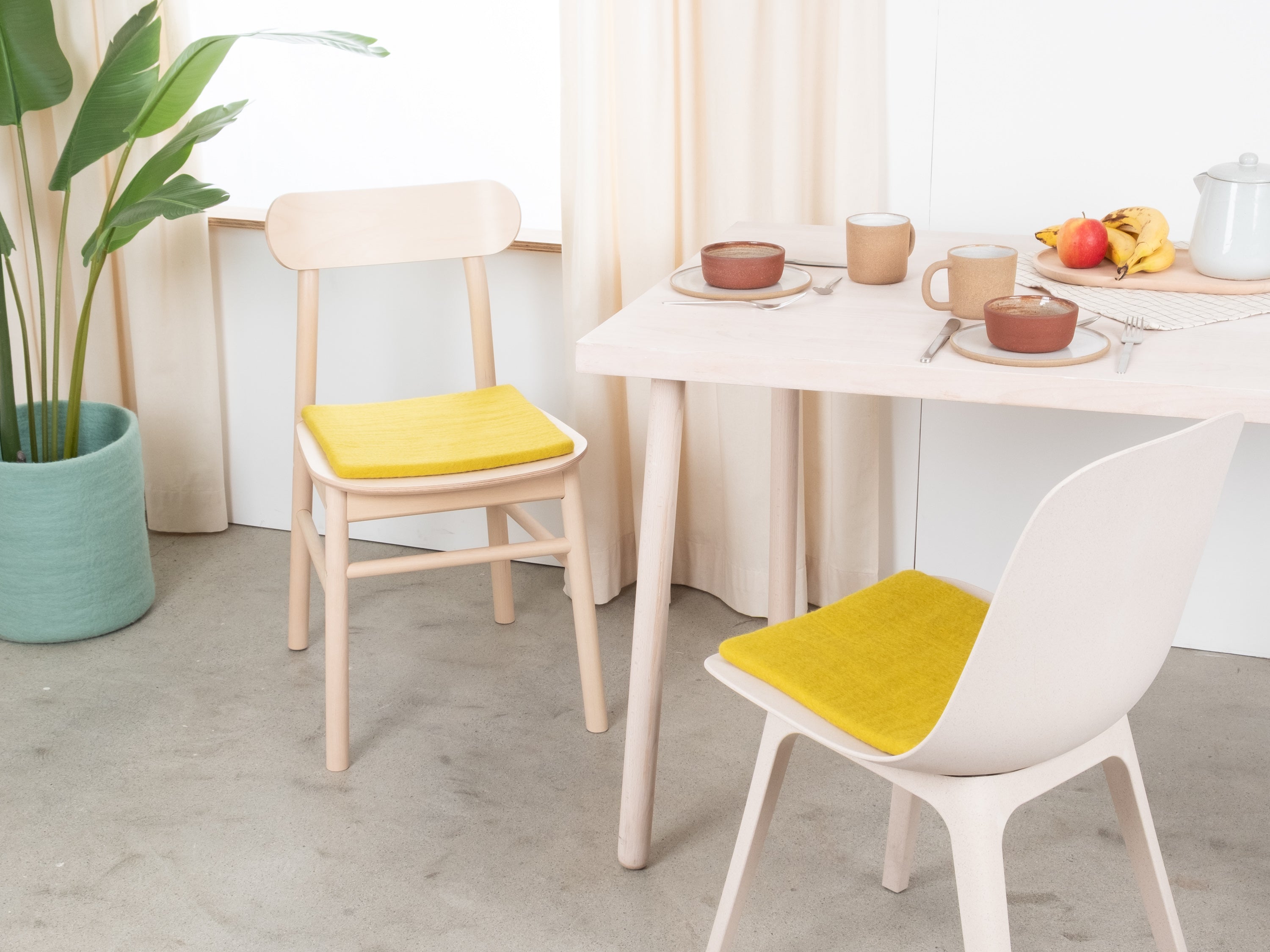 El cojín de asiento plano verde amarillento Kata aporta calidez y suavidad a tu silla favorita. Fabricado con lana virgen pura, hecho a mano en Nepal y producido en condiciones justas. Los cojines de asiento myfelt son repelentes al agua y la suciedad y se pueden utilizar por ambos lados.
