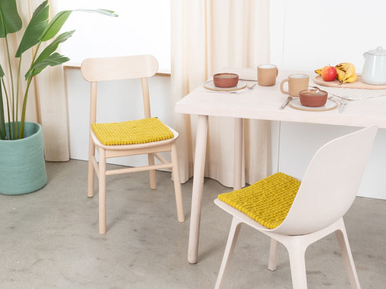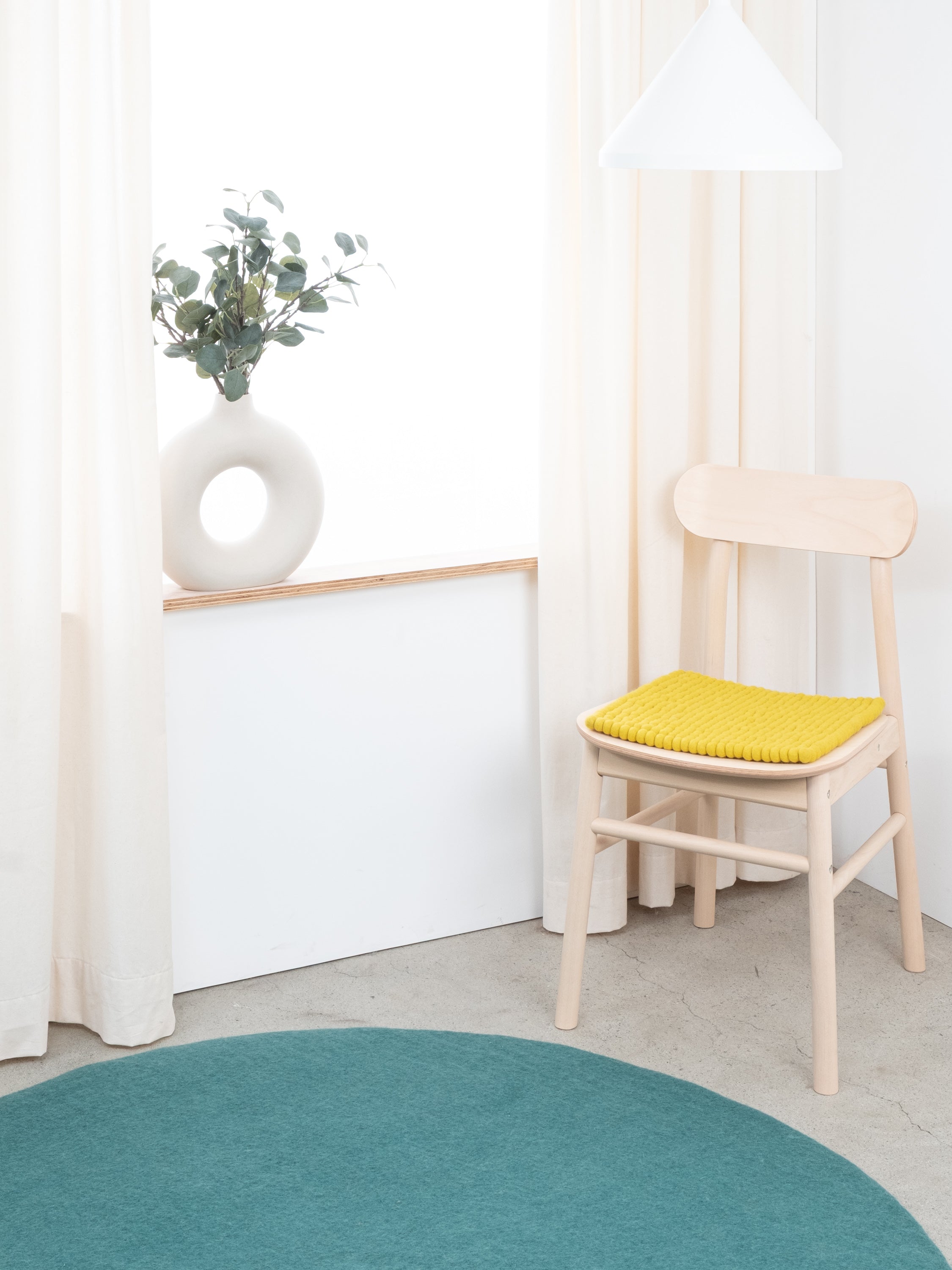 El cojín de asiento verde amarillento Kata aporta calidez y suavidad a tu silla favorita. Fabricado con lana virgen pura, hecho a mano en Nepal y producido en condiciones justas. Los cojines de asiento myfelt son repelentes al agua y la suciedad y se pueden utilizar por ambos lados.
