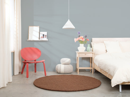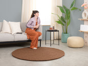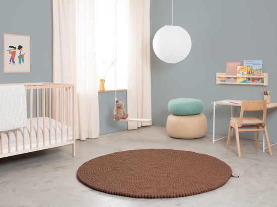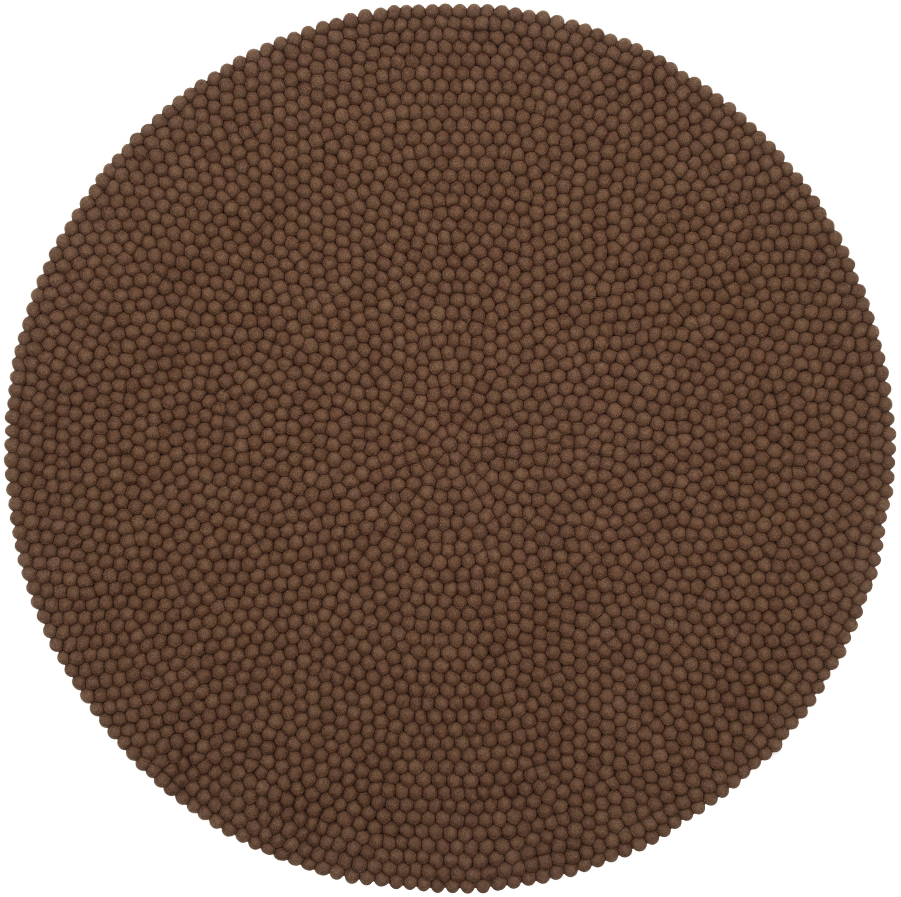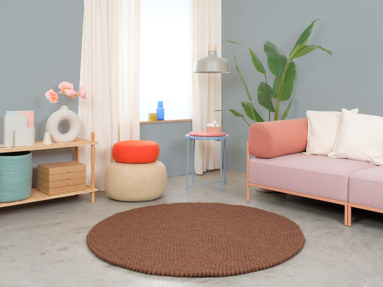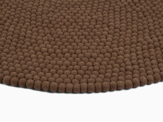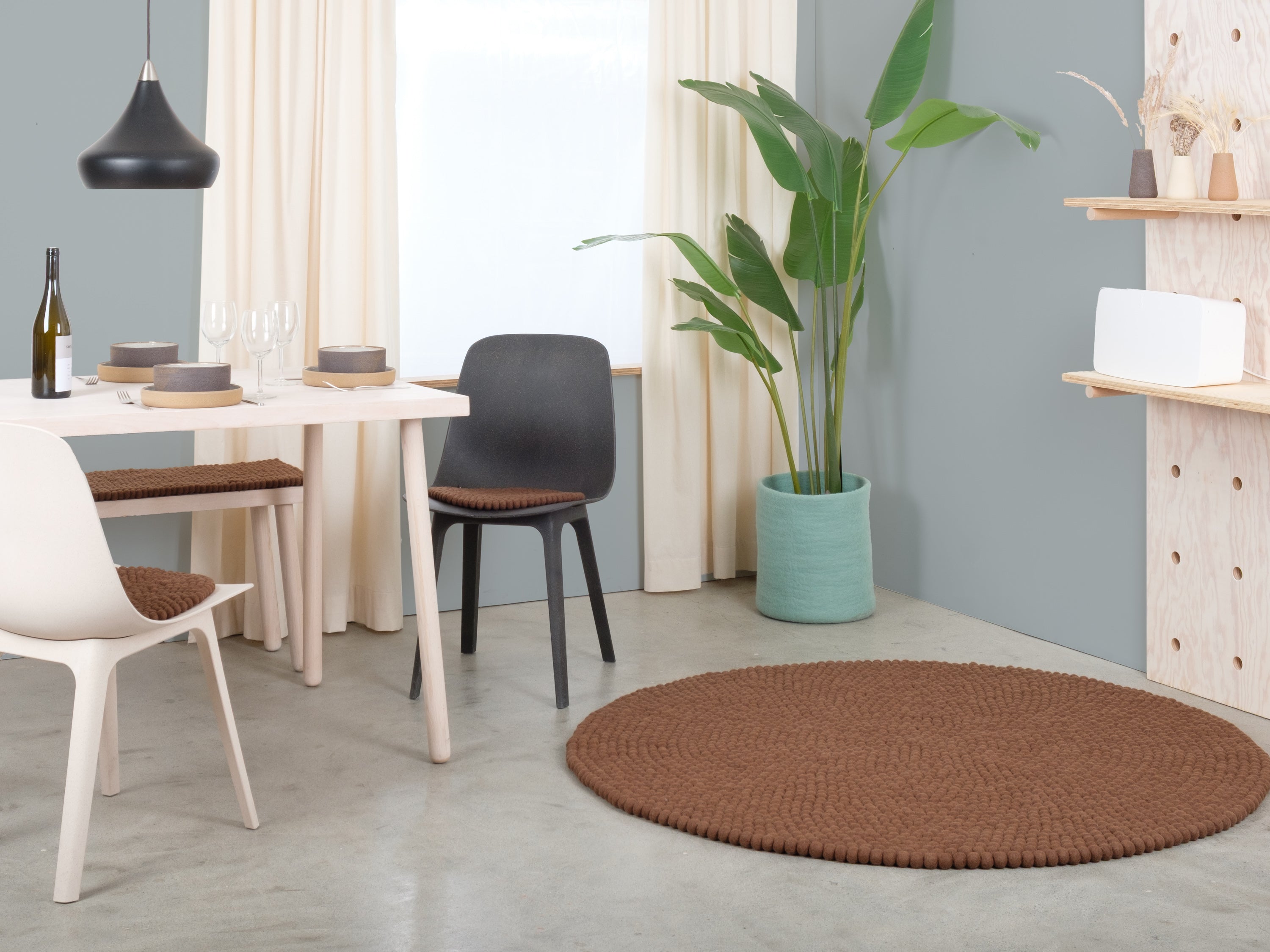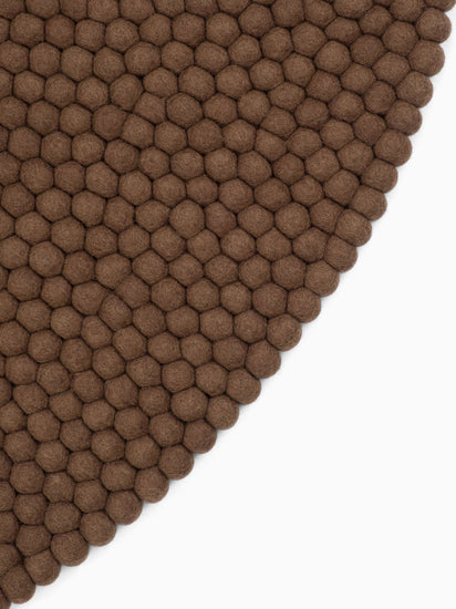 Egon apuesta por un cálido marrón chocolate. La alfombra de bolas de fieltro aporta equilibrio a cualquier espacio, creando confort y estructura. Ideal para rincones de lectura y zonas de estar que necesitan calidez. Resistente, estable en su forma y agradable al tacto. Hecha a mano en Nepal – 100 % pura lana virgen.
