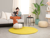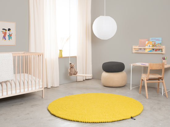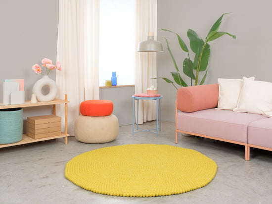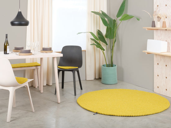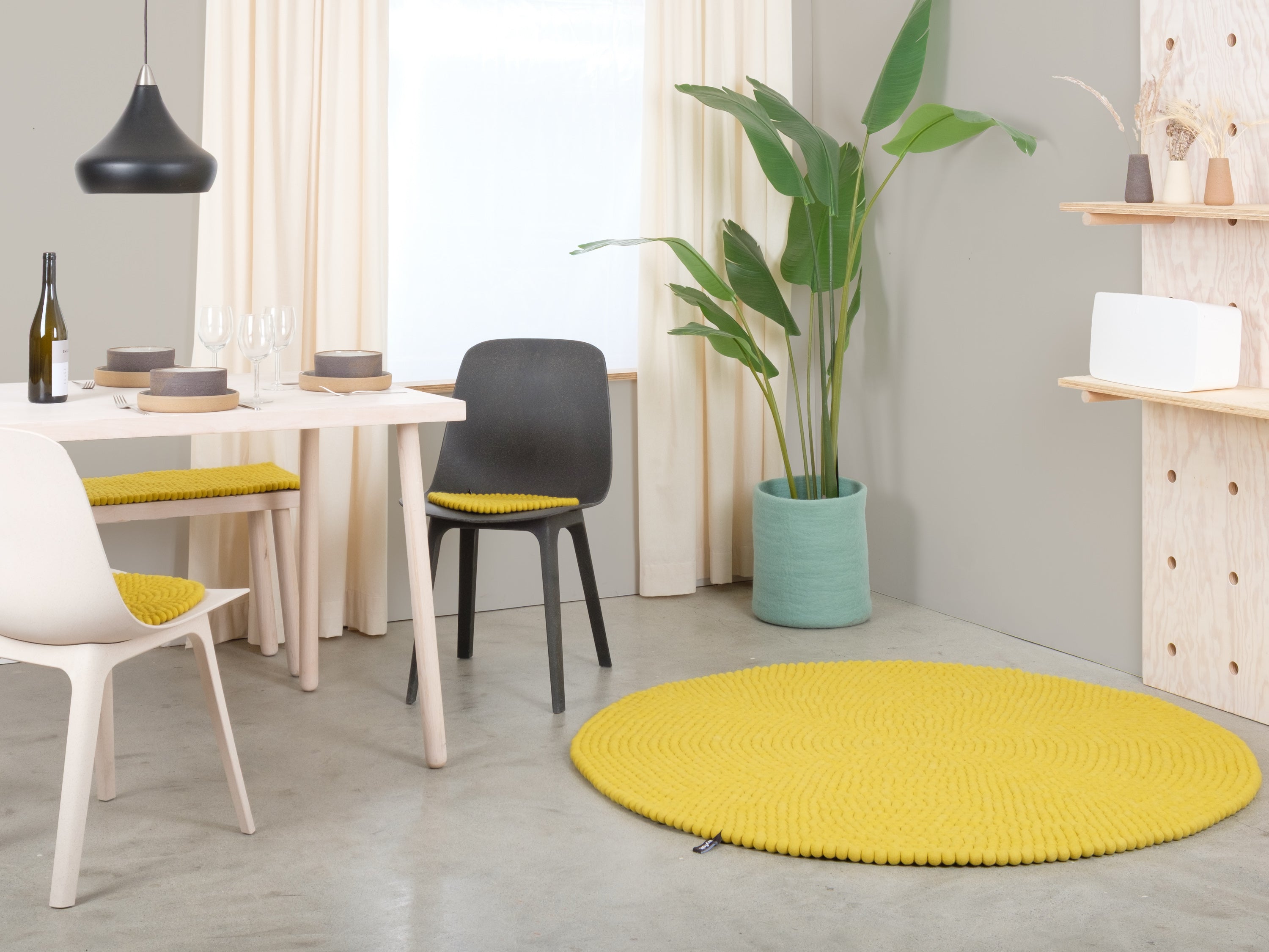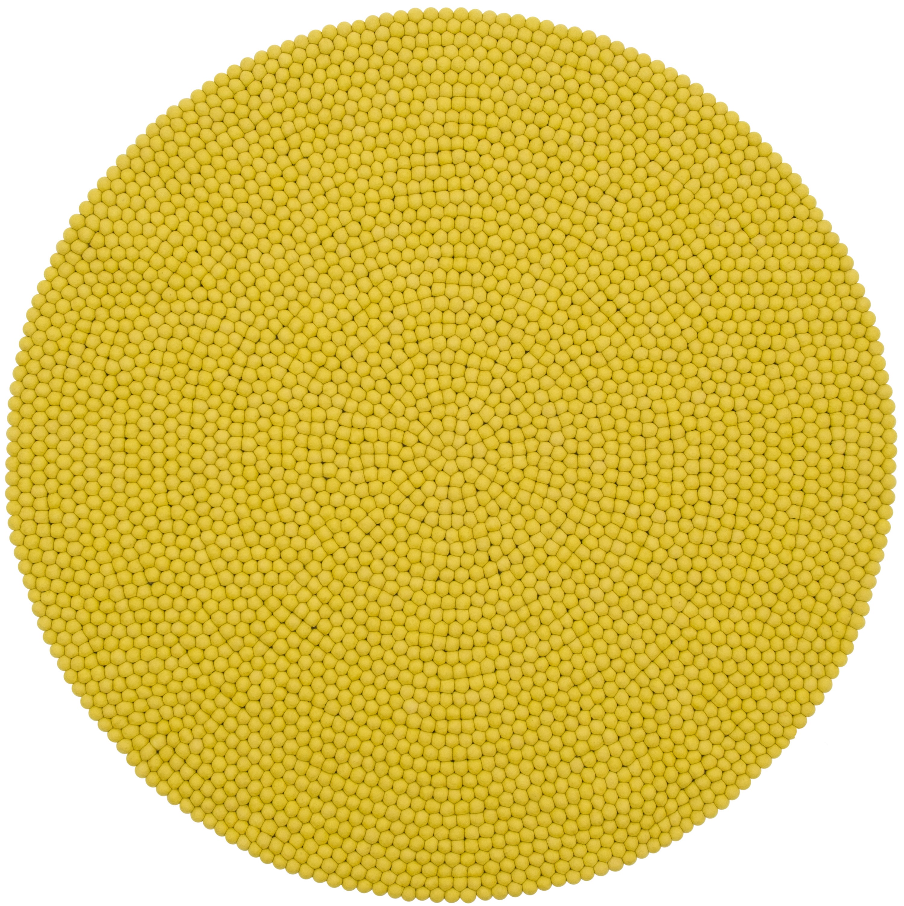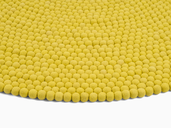 Alfombra redonda de bolas de fieltro, hecha de pura lana virgen.