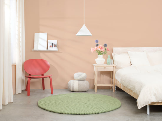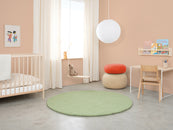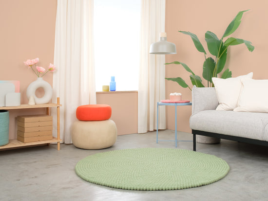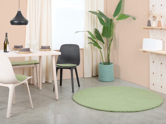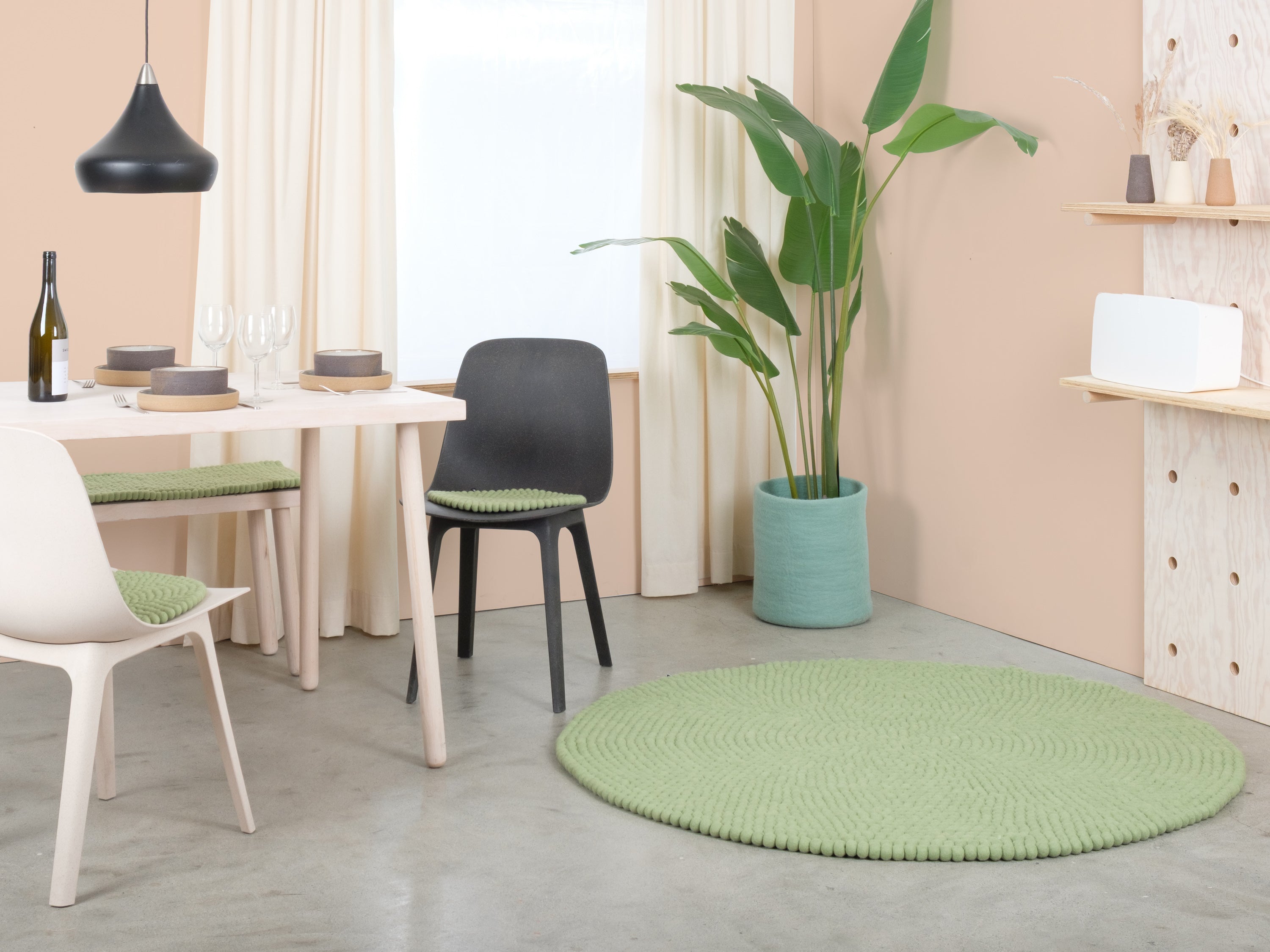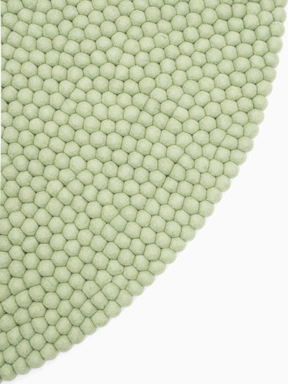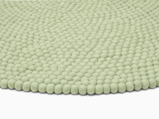Lasse es una alfombra de bolas de fieltro en un suave verde salvia. Aporta tranquilidad y ligereza a la habitación y combina con madera, blanco y tonos naturales. Suave al pisar, resistente en el uso diario y naturalmente repelente a la suciedad. Hecha a mano en Nepal con 100 % pura lana virgen.