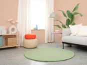 Alfombra redonda de bolas de fieltro, hecha de pura lana virgen.