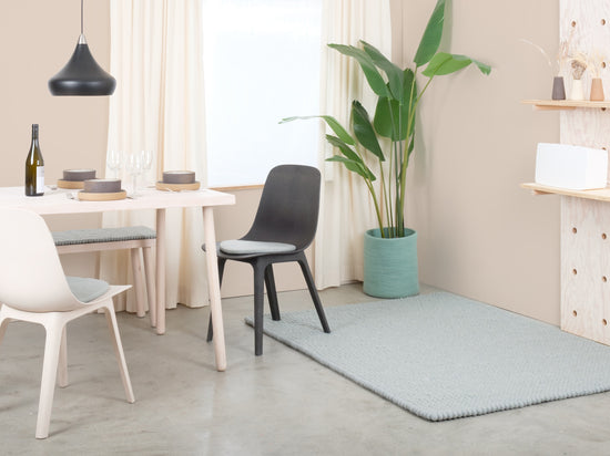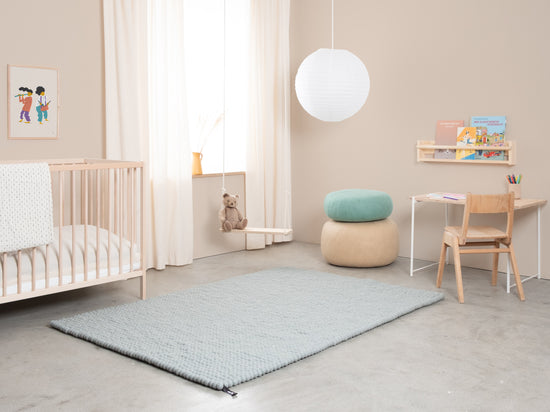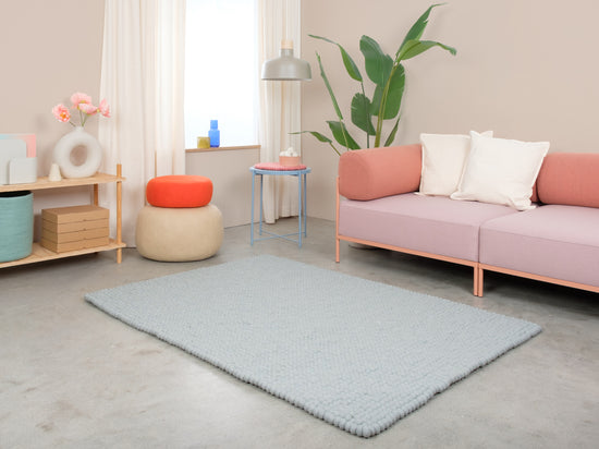 Liv es una alfombra de bolas de fieltro en un fresco azul claro. Aporta claridad y ligereza a la habitación y hace que los espacios pequeños parezcan más grandes. Combina con blanco, roble y tonos neutros – como base tranquila o acento fresco. Suave, absorbente del sonido y naturalmente repelente de la suciedad. Hecha a mano en Nepal con 100 % pura lana virgen.