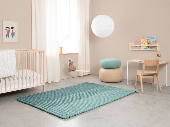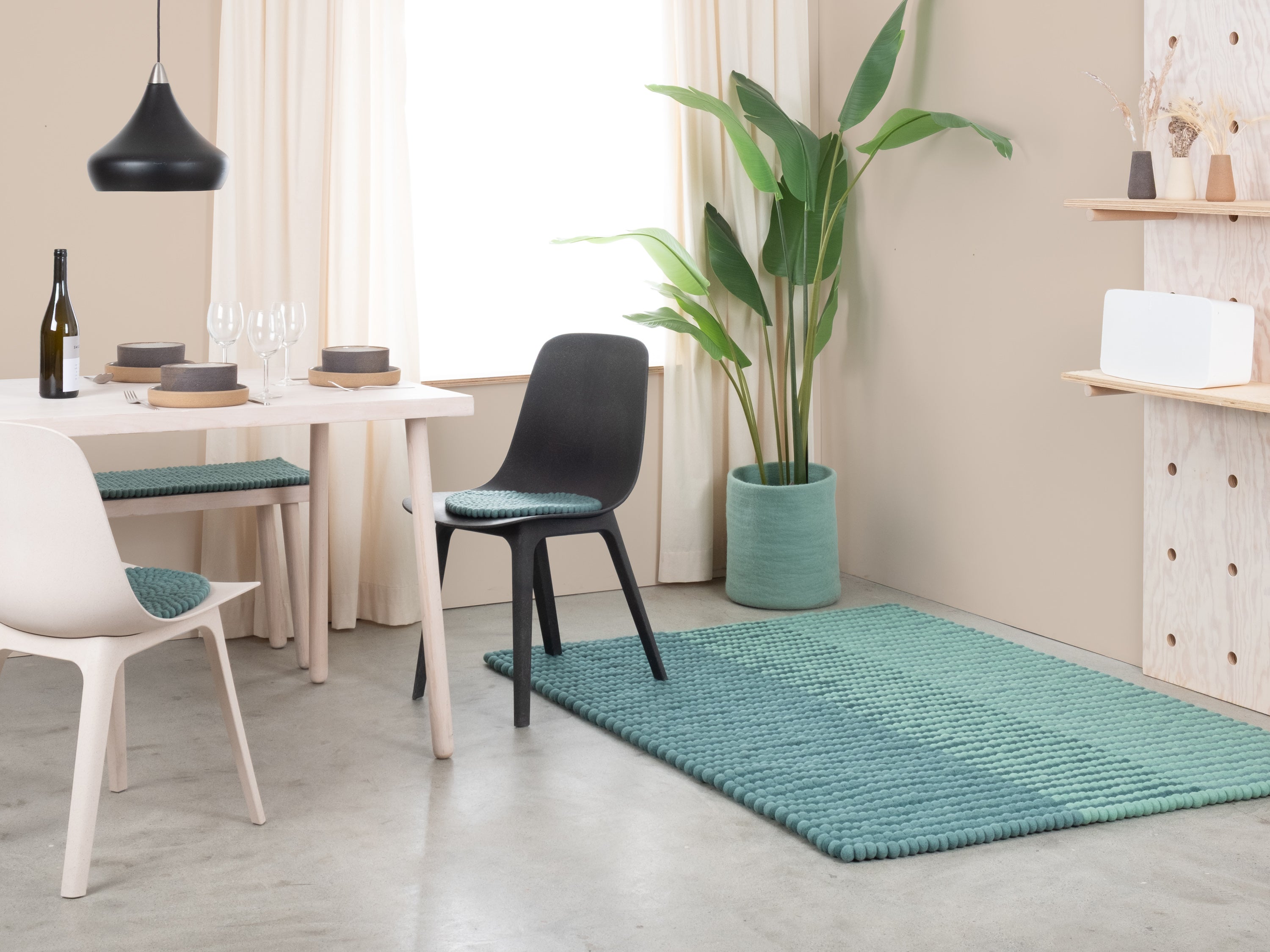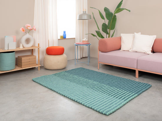 Alfombra rectangular de bolas de fieltro, de pura lana virgen.
