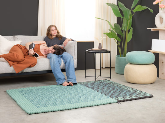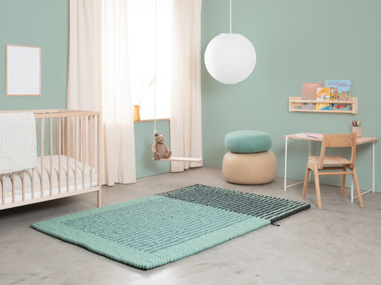 Alfombra rectangular de bolas de fieltro, de pura lana virgen.