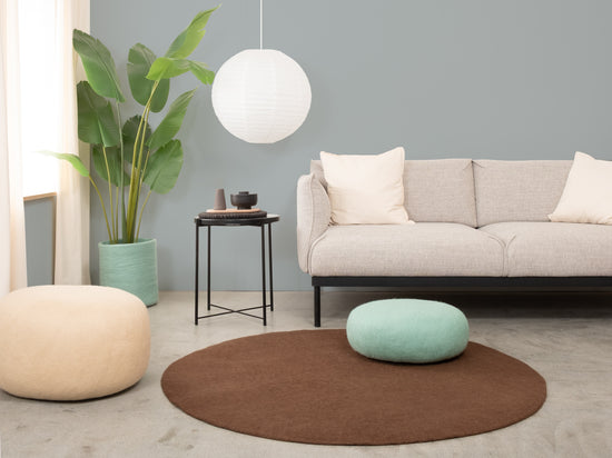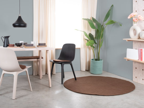 Egon apuesta por un cálido marrón chocolate. Esta alfombra de fieltro da tierra, calidez y estructura a cualquier estancia. Ideal para rincones de lectura y zonas de estar que agradecen más calidez. Resistente, mantiene la forma y agradable al pisar. Hecha a mano en Nepal – 100 % lana virgen.