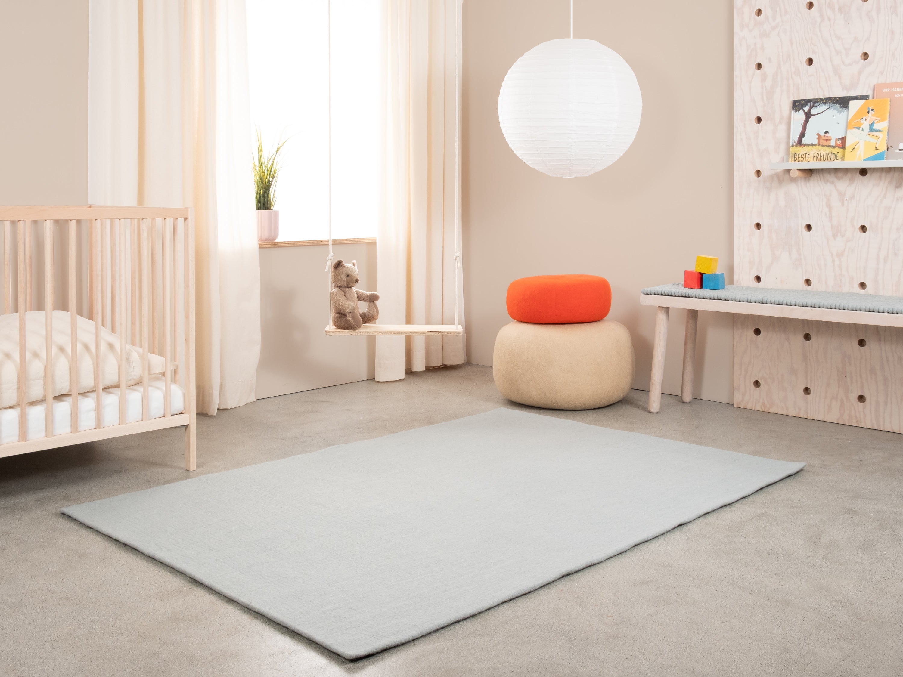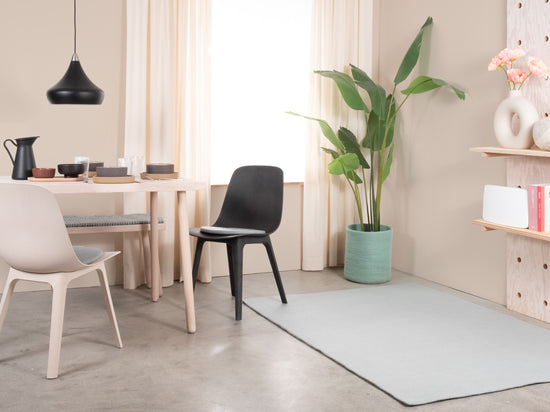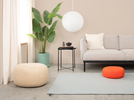 Liv es una alfombra de fieltro en un fresco azul claro. Aporta claridad y ligereza a la habitación y hace que los espacios pequeños parezcan más grandes. Combina con blanco, roble y tonos neutros – como base tranquila o acento fresco. Suave, absorbente del sonido y naturalmente repelente a la suciedad. Hecha a mano en Nepal con 100 % pura lana virgen.