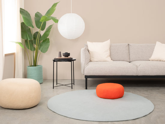 Alfombra de fieltro redonda, hecha de pura lana virgen.