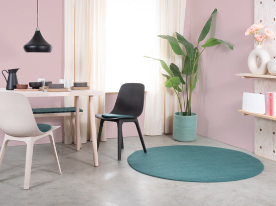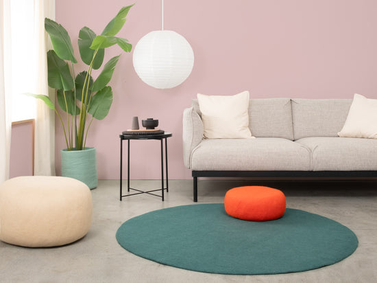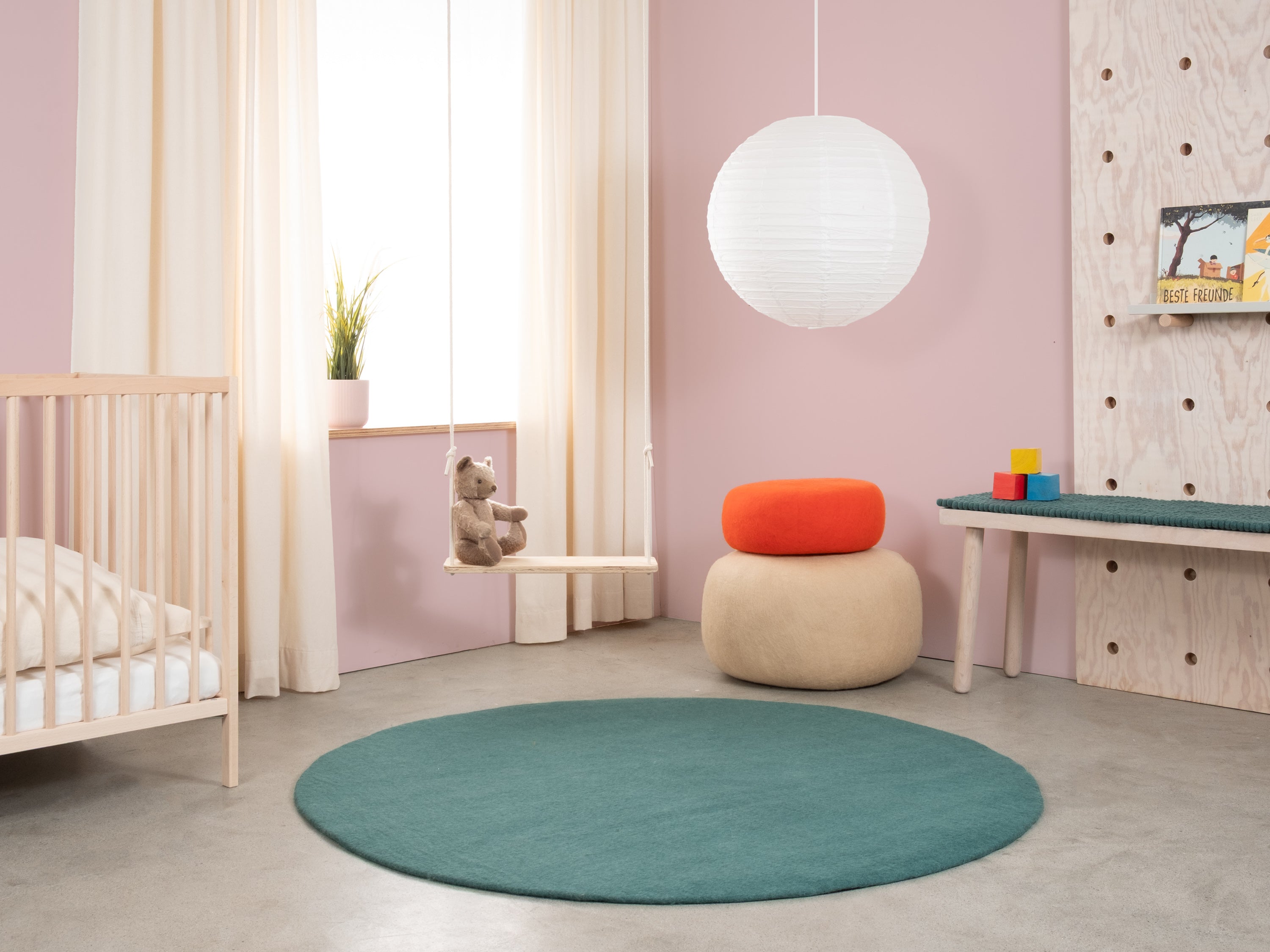 Alfombra de fieltro redonda, hecha de pura lana virgen.