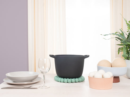 El salvamanteles Fine en el color turquesa combina funcionalidad con un diseño encantador. Robusto, resistente al calor, repelente al agua y a la suciedad, y reversible. Fabricado con pura lana virgen, hecho a mano en Nepal y producido en condiciones justas.