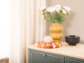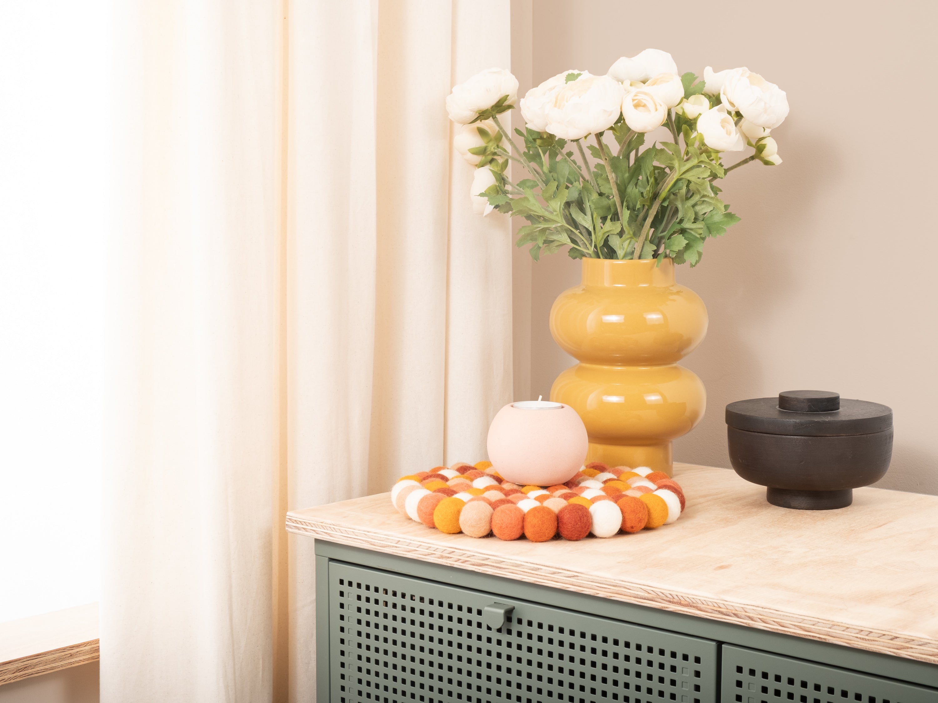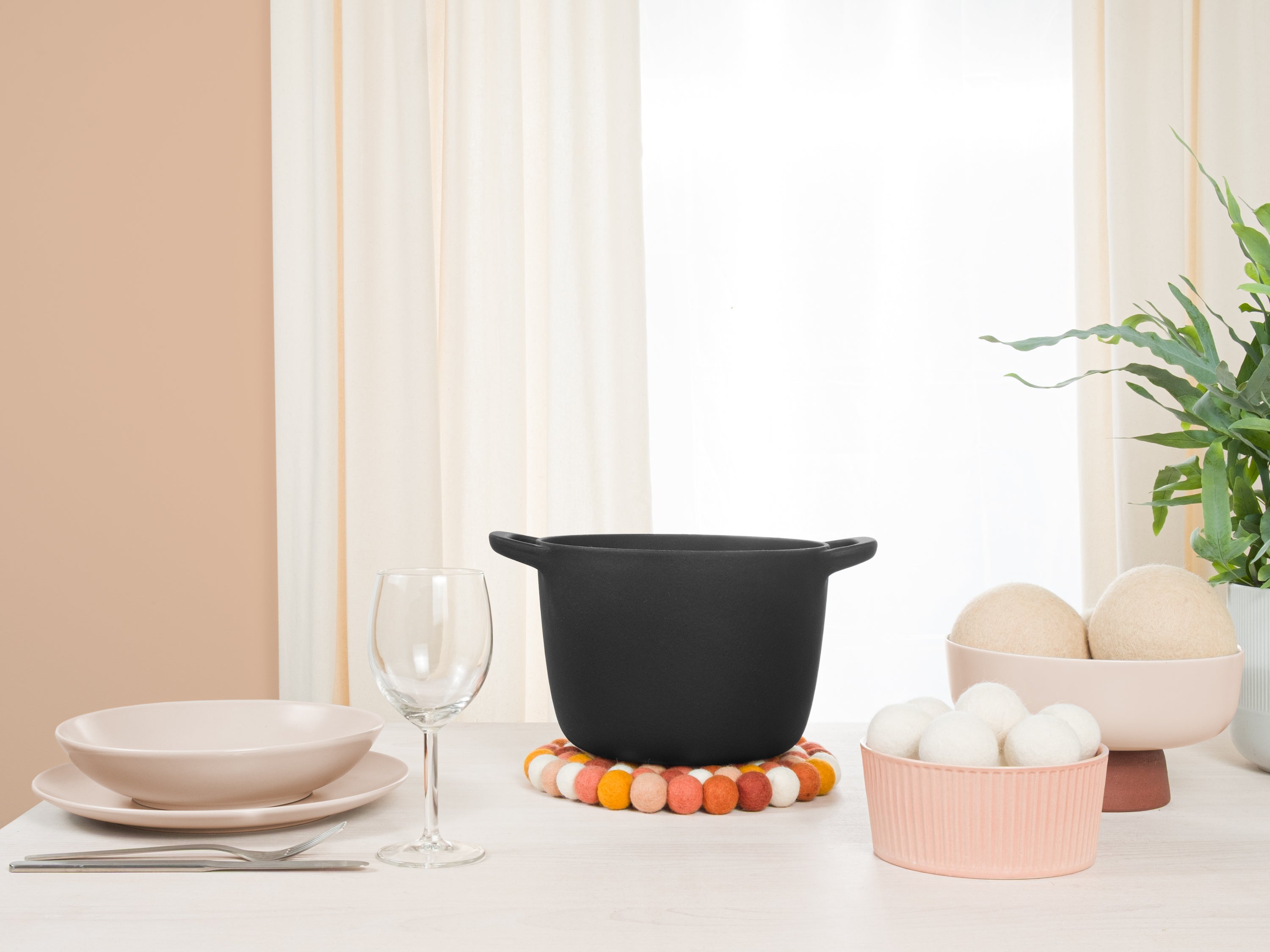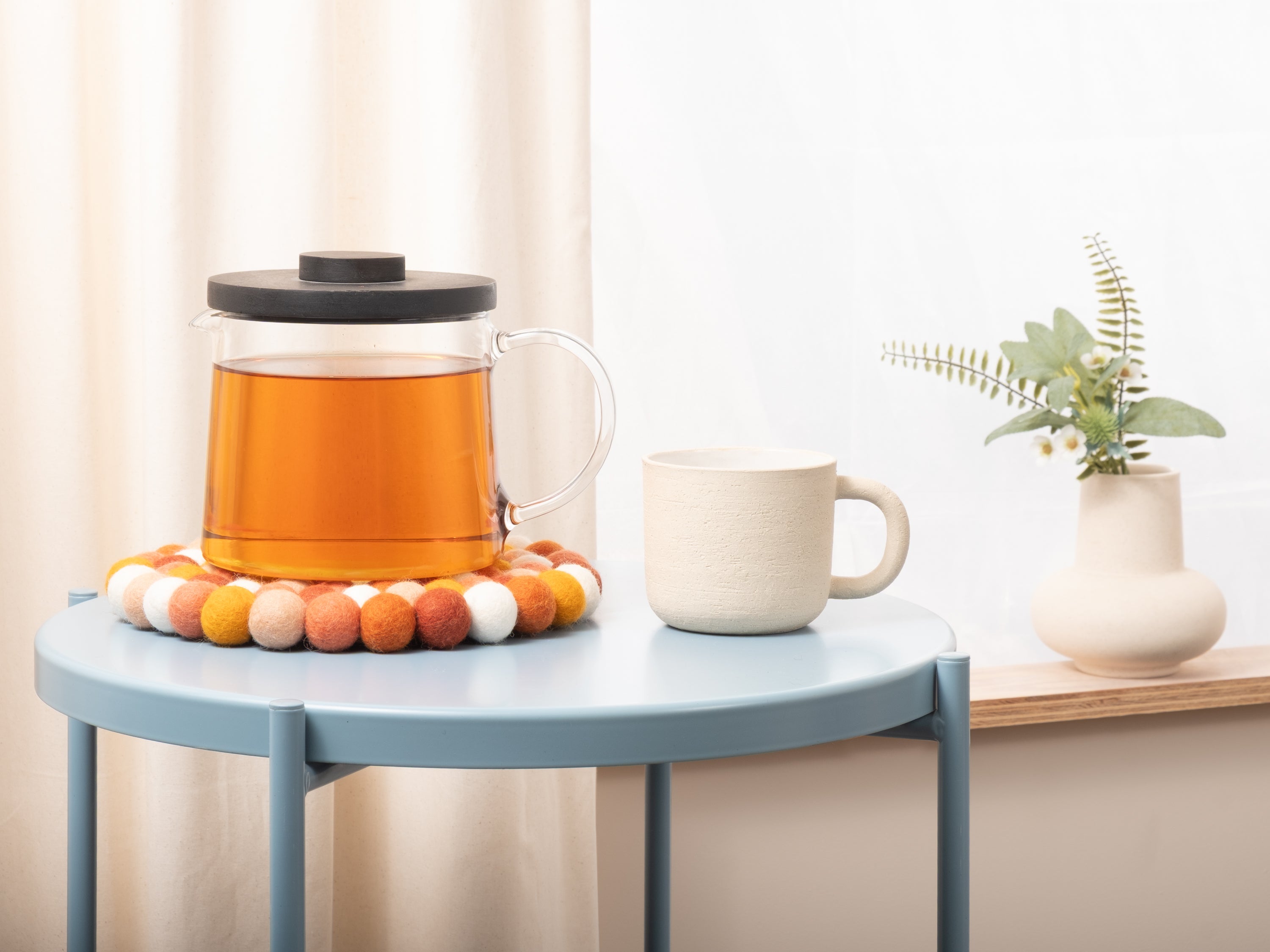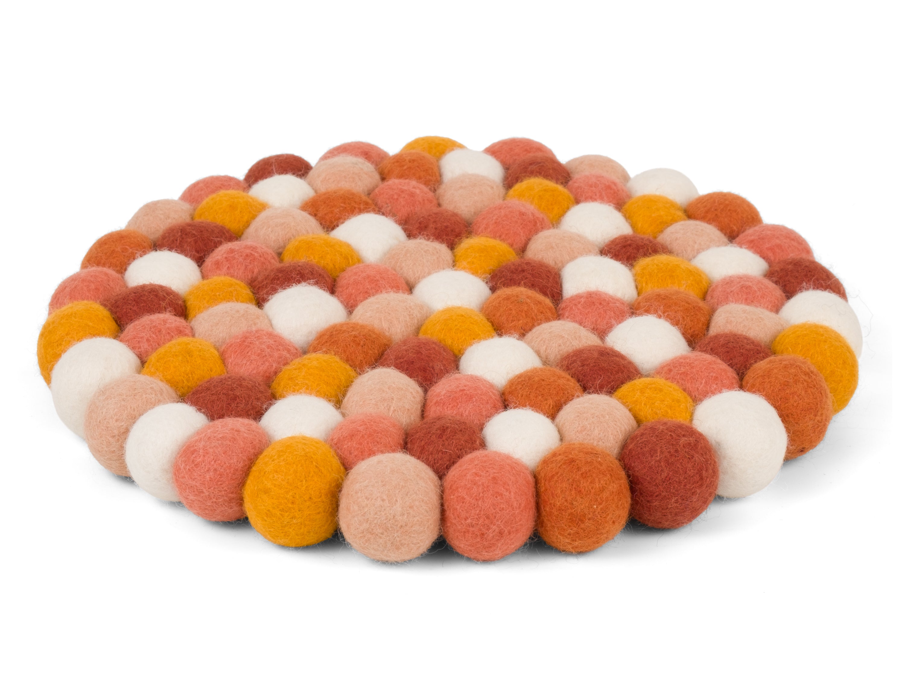 El salvamanteles Juna en el color multicolor combina funcionalidad con un diseño encantador. Robusto, resistente al calor, repelente al agua y a la suciedad, y reversible. Fabricado con pura lana virgen, hecho a mano en Nepal y producido en condiciones justas.