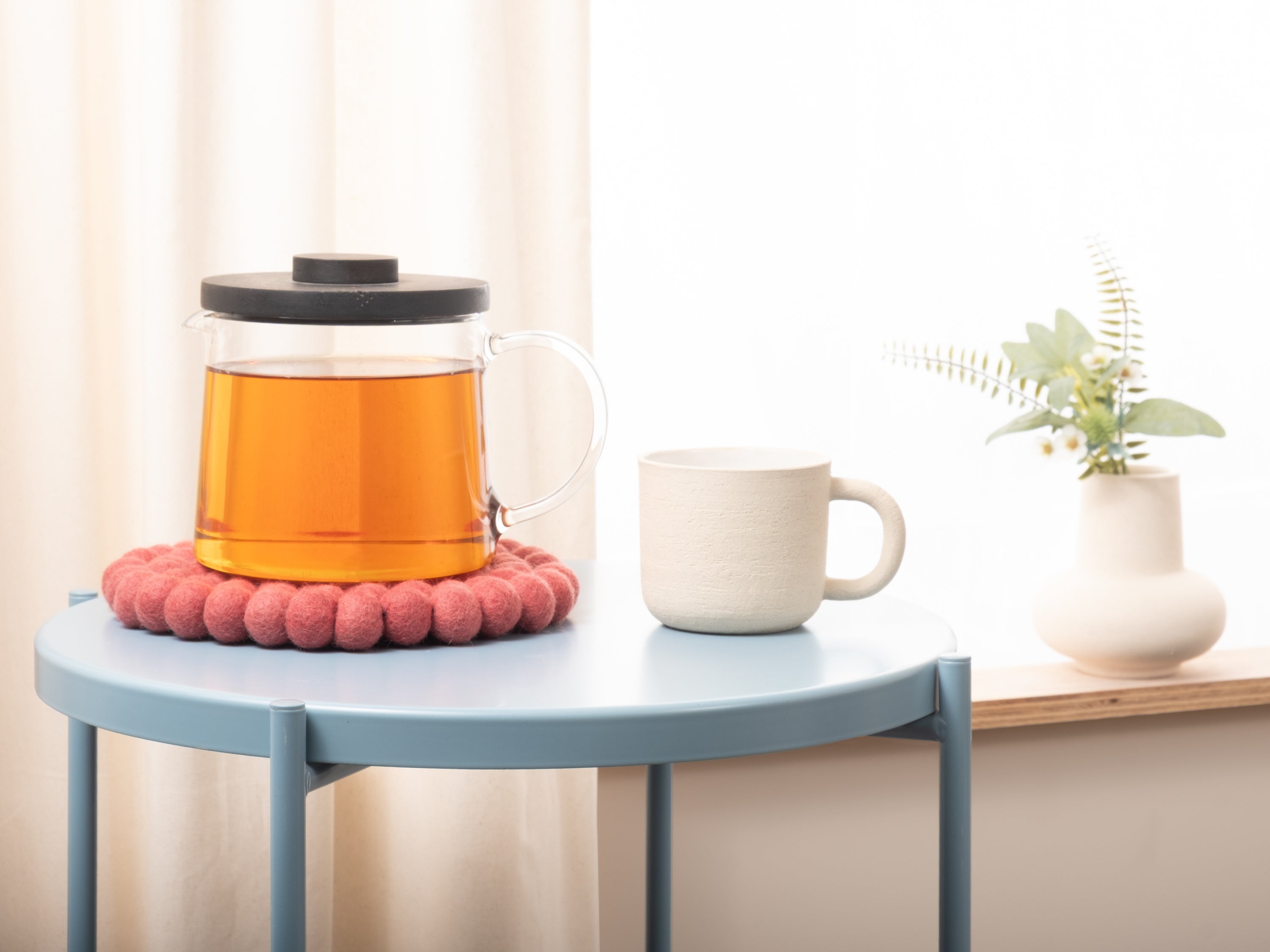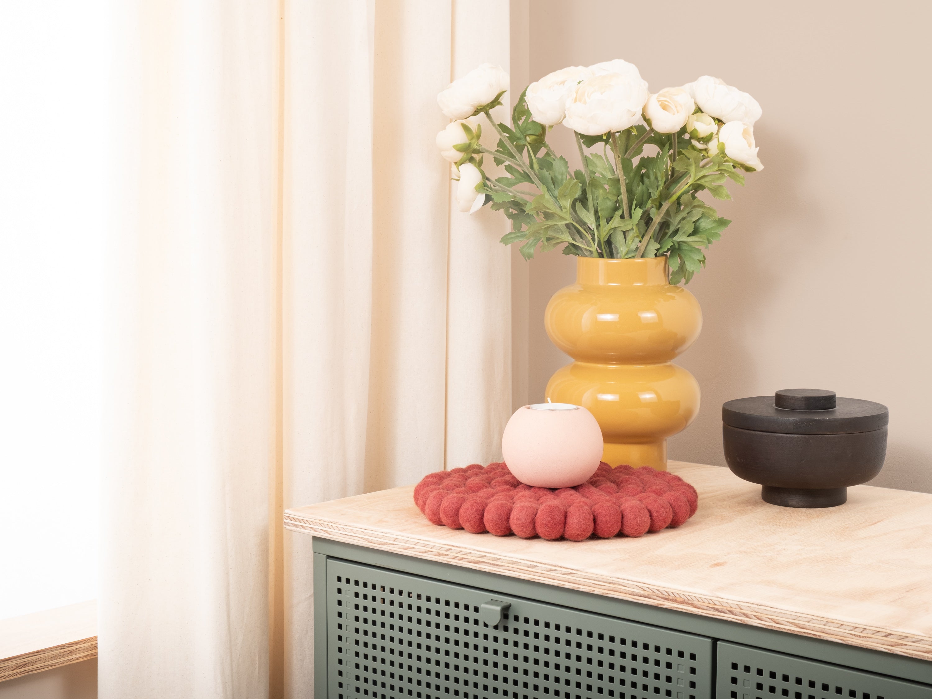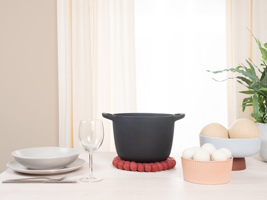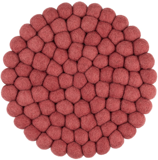 El salvamanteles Kaja en el color rojo vino combina funcionalidad con un diseño encantador. Robusto, resistente al calor, repelente al agua y a la suciedad, y reversible. Fabricado con pura lana virgen, hecho a mano en Nepal y producido en condiciones justas.