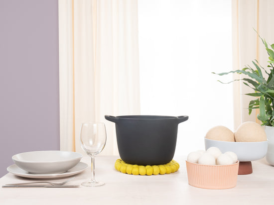 El salvamanteles Kata en el color verde amarillento combina funcionalidad con un diseño encantador. Robusto, resistente al calor, repelente al agua y a la suciedad, y reversible. Fabricado con pura lana virgen, hecho a mano en Nepal y producido en condiciones justas.