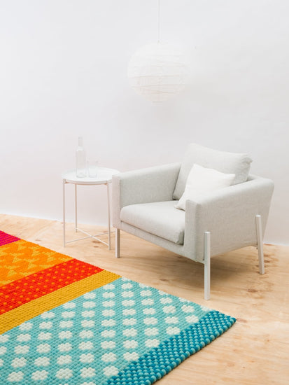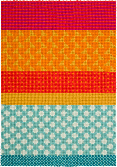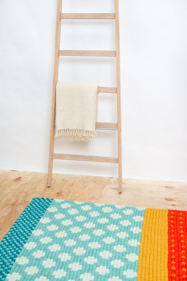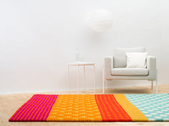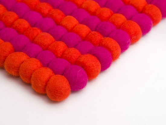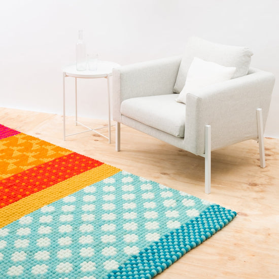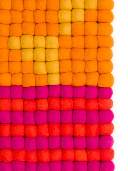 Alfombra rectangular de bolas de fieltro fabricada en pura lana virgen.
