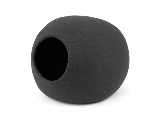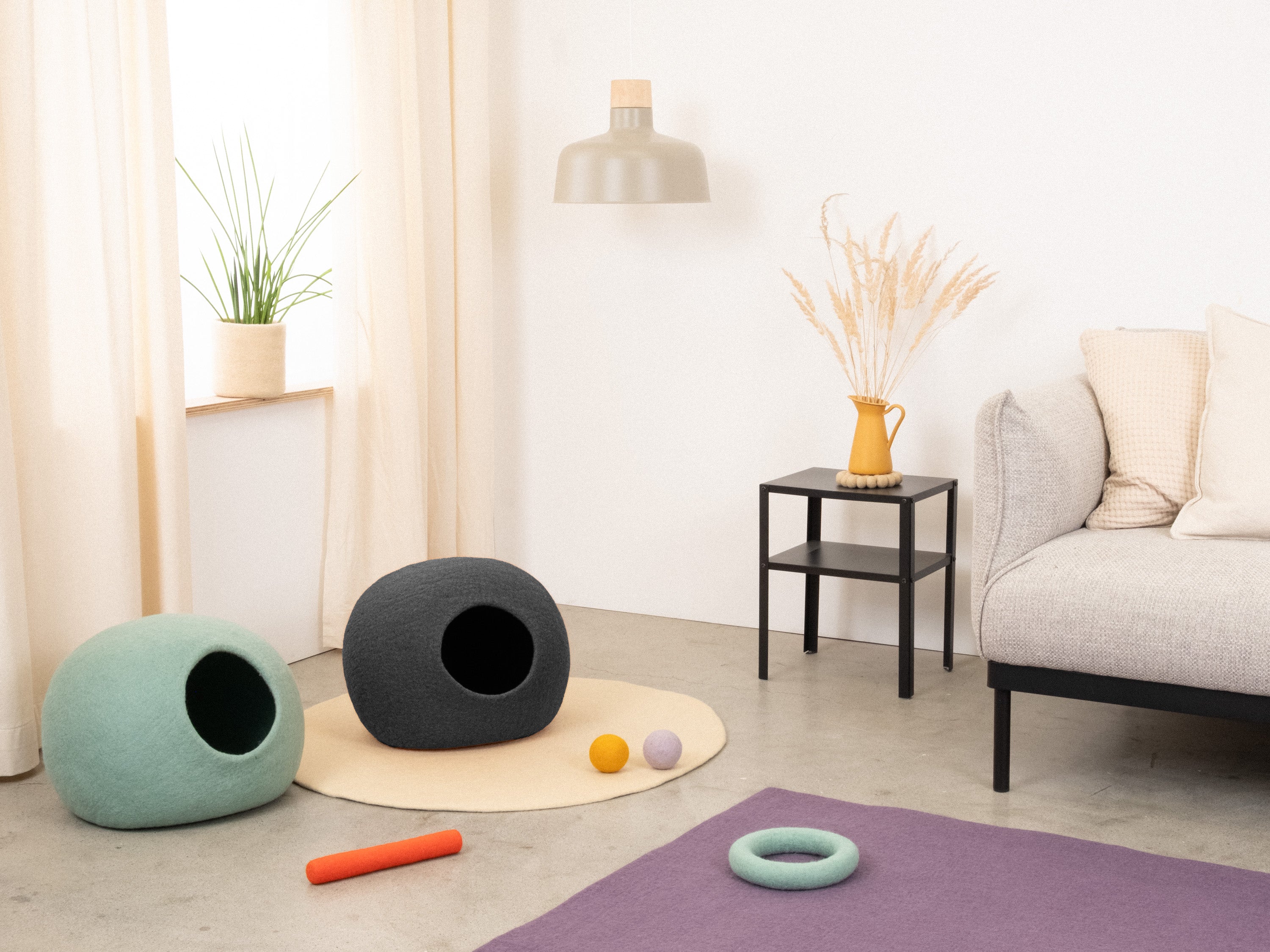 En la cueva hecha a mano con pura lana virgen, los gatos grandes y pequeños se sienten cómodos y seguros. El material sostenible es fácil de cuidar, higiénico y antibacteriano gracias a la grasa natural de la lana. El fieltro de lana tiene propiedades antiestáticas y regula la temperatura. La cueva de fieltro es cálida y confortable en invierno y agradablemente fresca en verano.