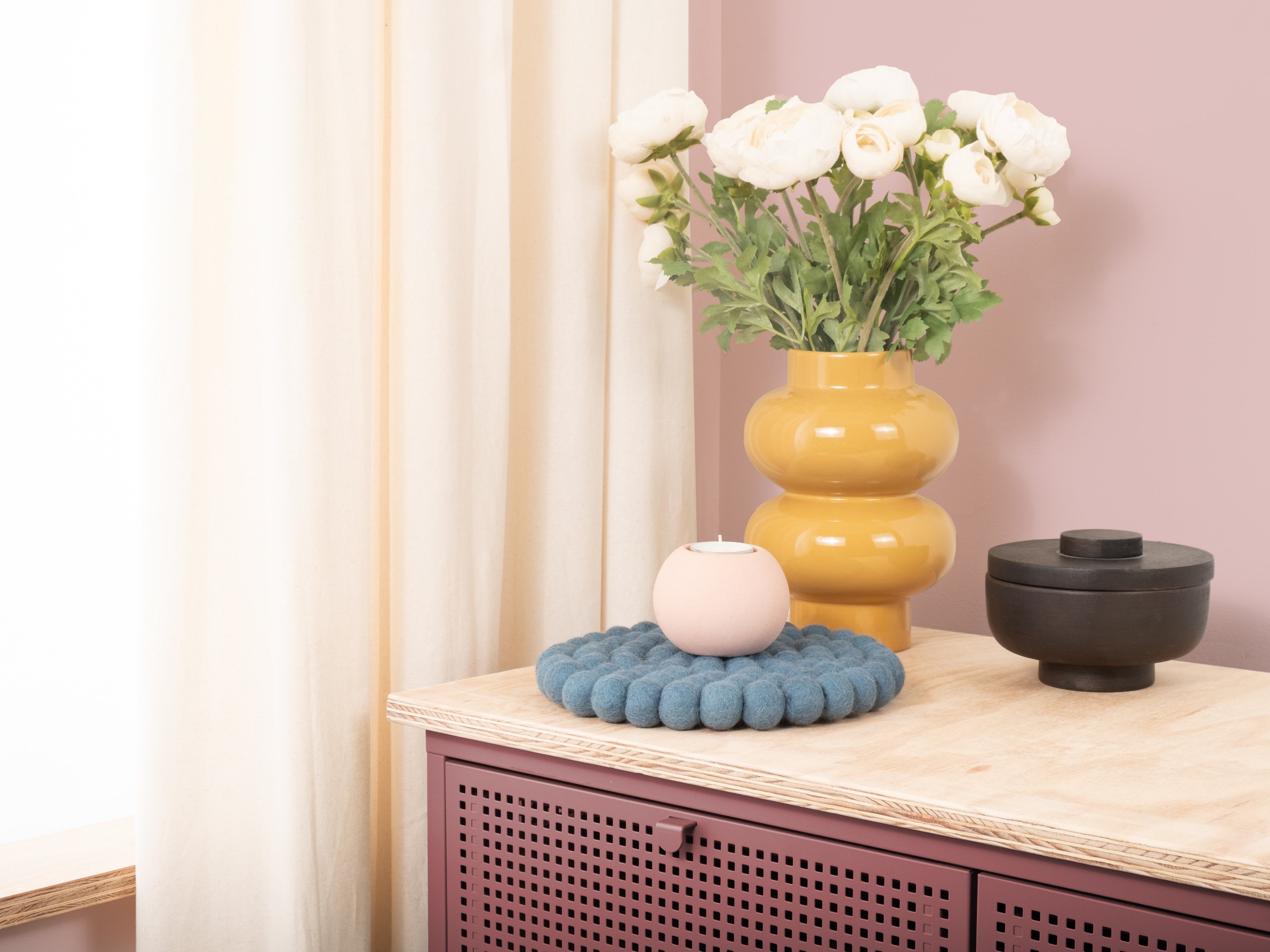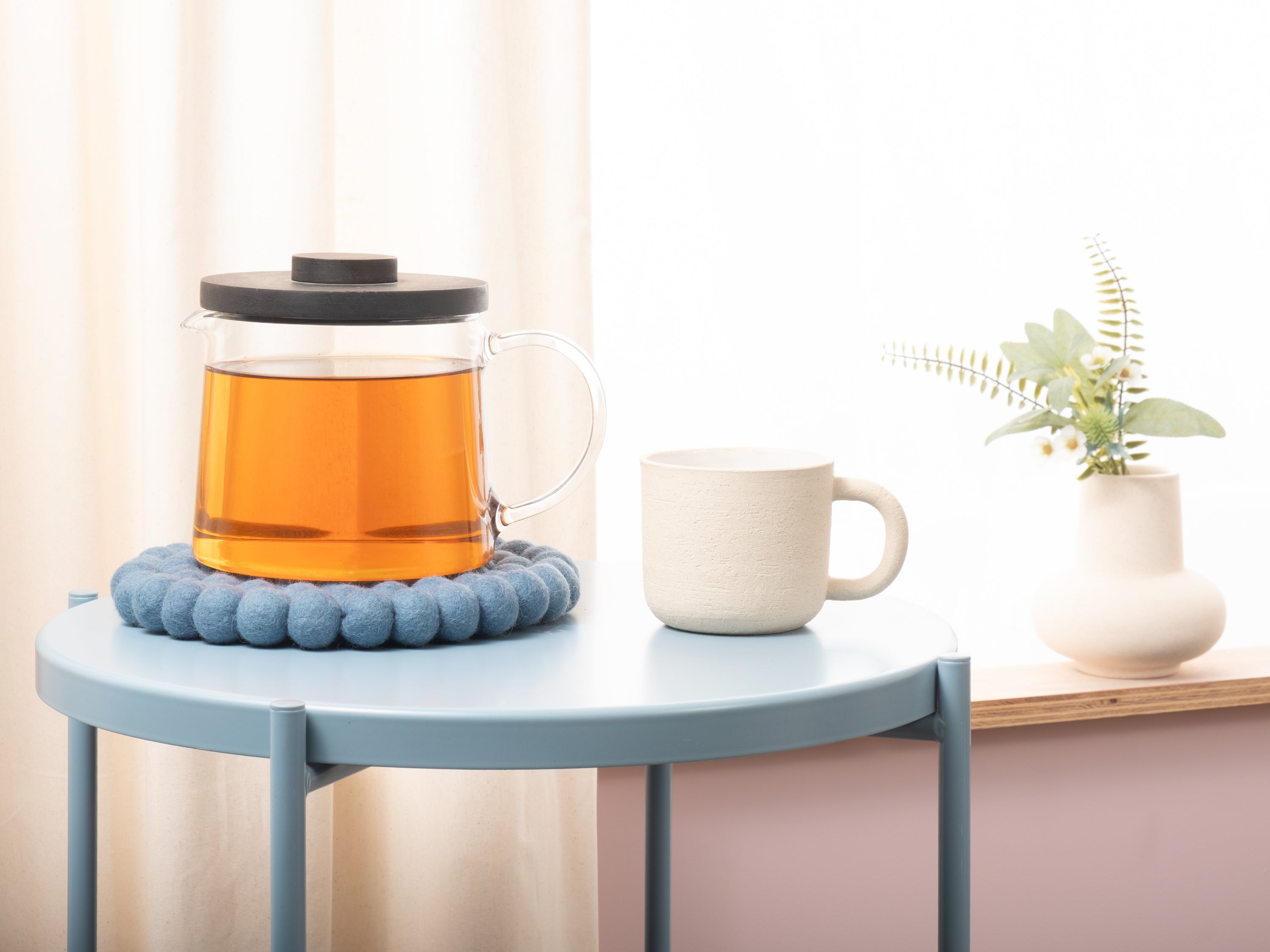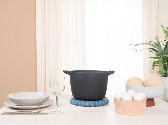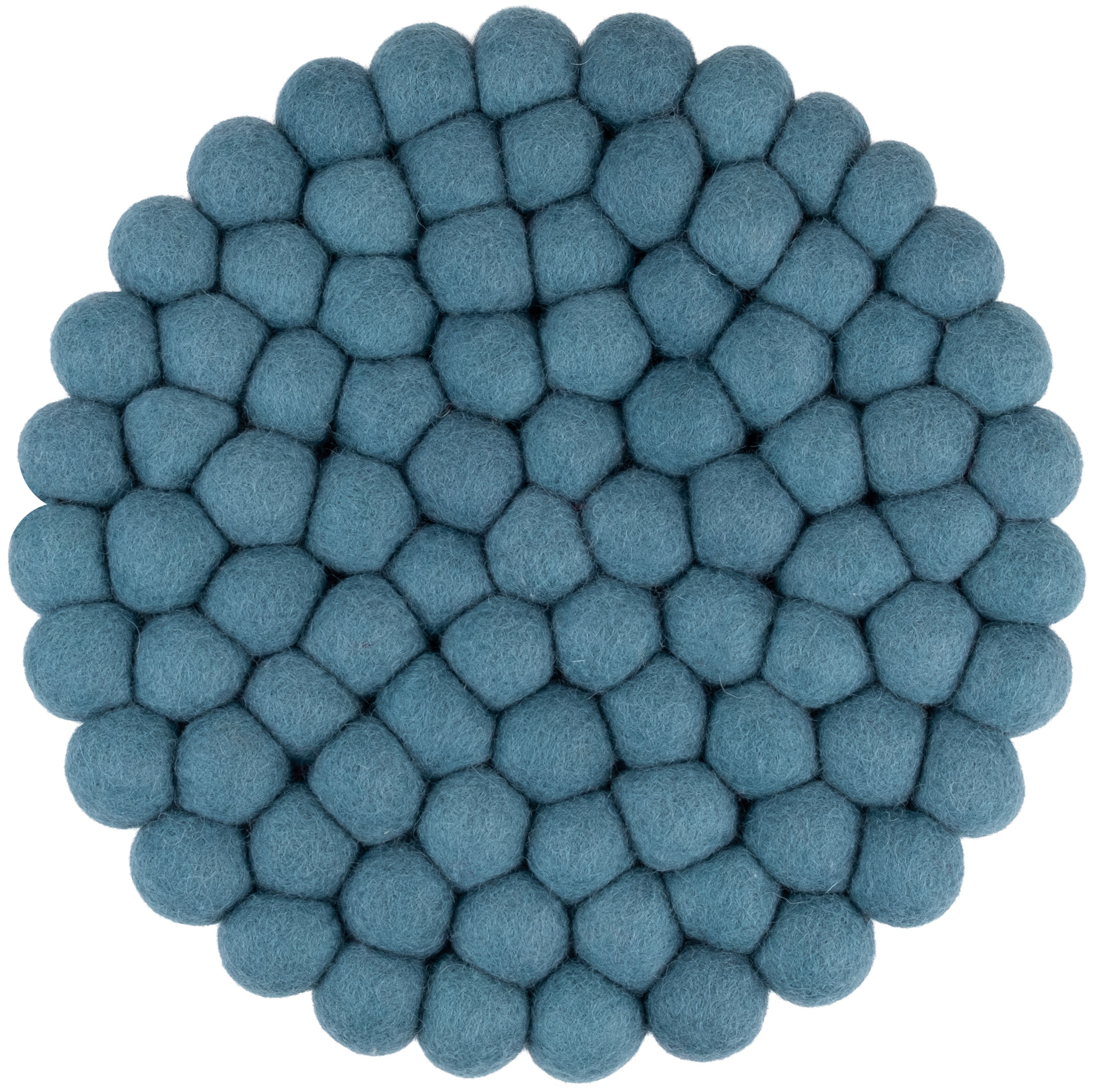 El salvamanteles Nilo en el color azul combina funcionalidad con un diseño encantador. Robusto, resistente al calor, repelente al agua y a la suciedad, y reversible. Fabricado con pura lana virgen, hecho a mano en Nepal y producido en condiciones justas.