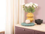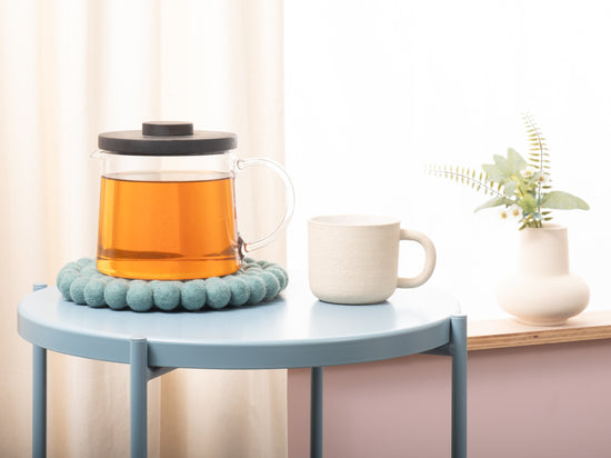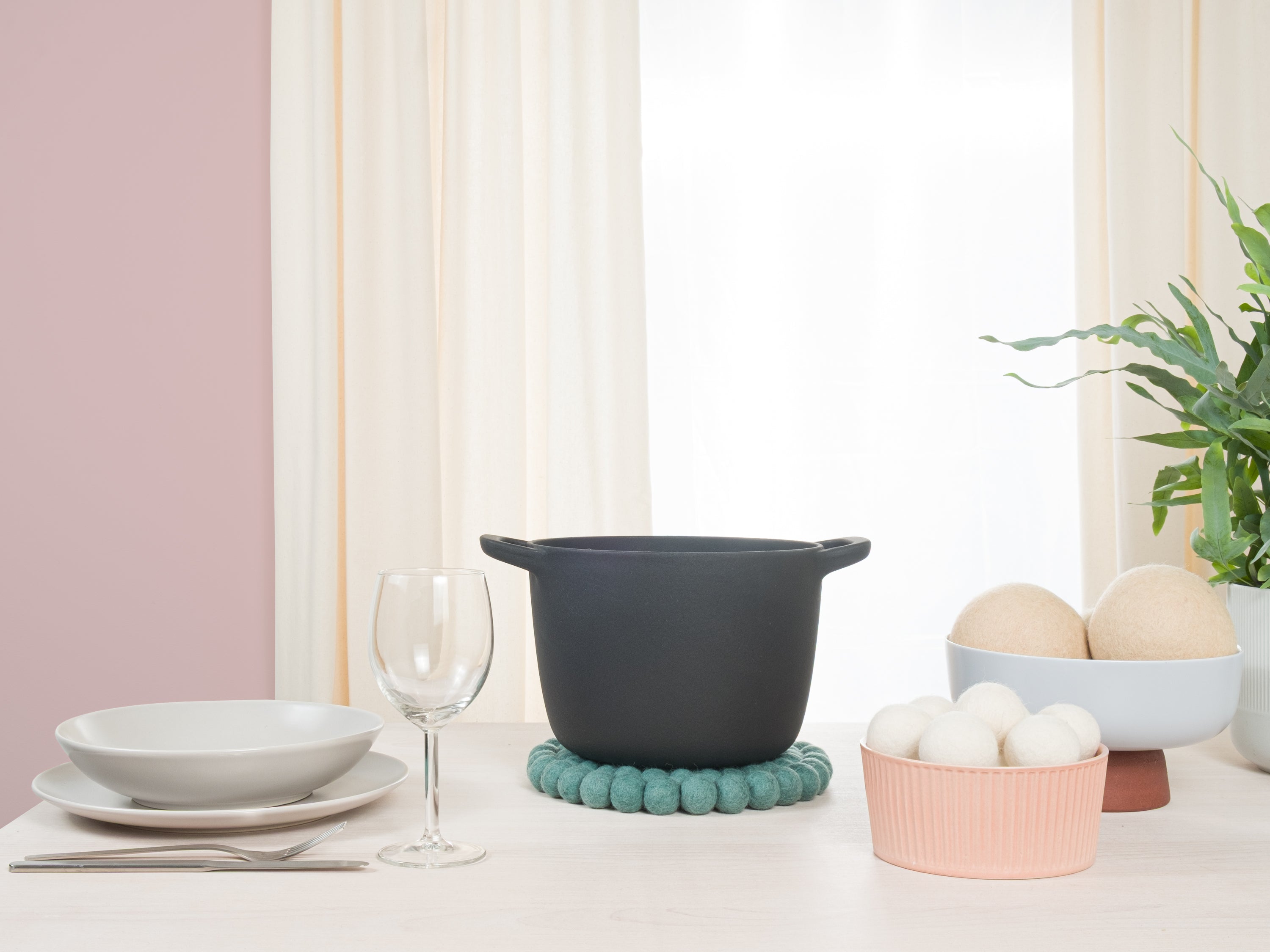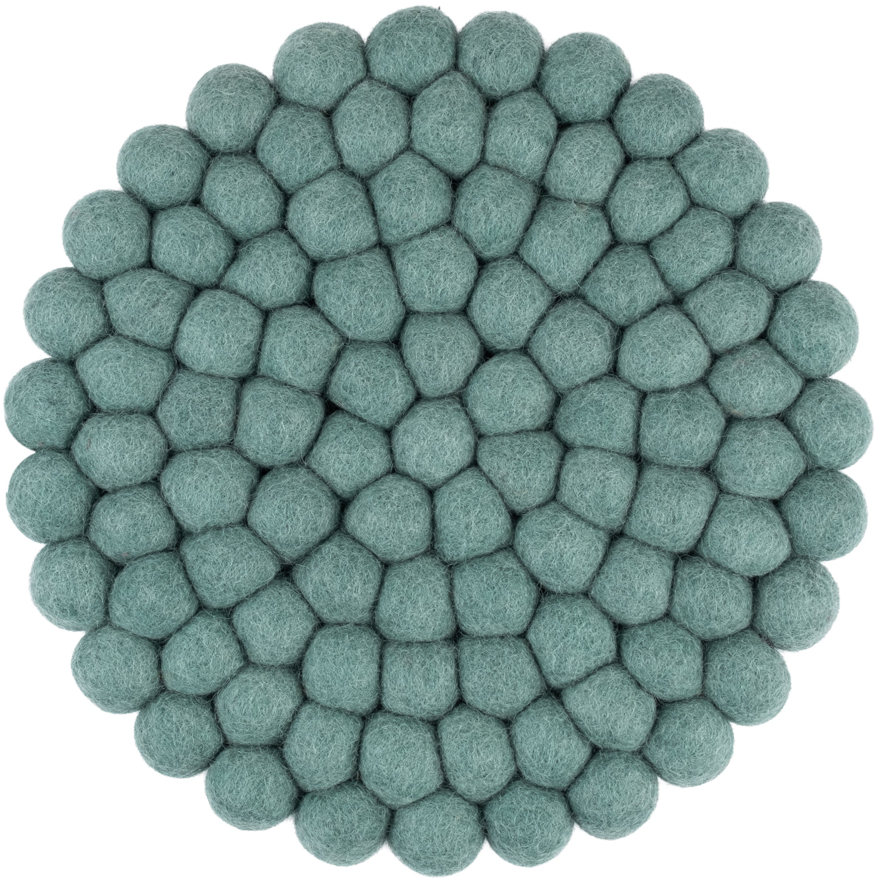 El salvamanteles Taro en el color aqua combina funcionalidad con un diseño encantador. Robusto, resistente al calor, repelente al agua y a la suciedad, y reversible. Fabricado con pura lana virgen, hecho a mano en Nepal y producido en condiciones justas.