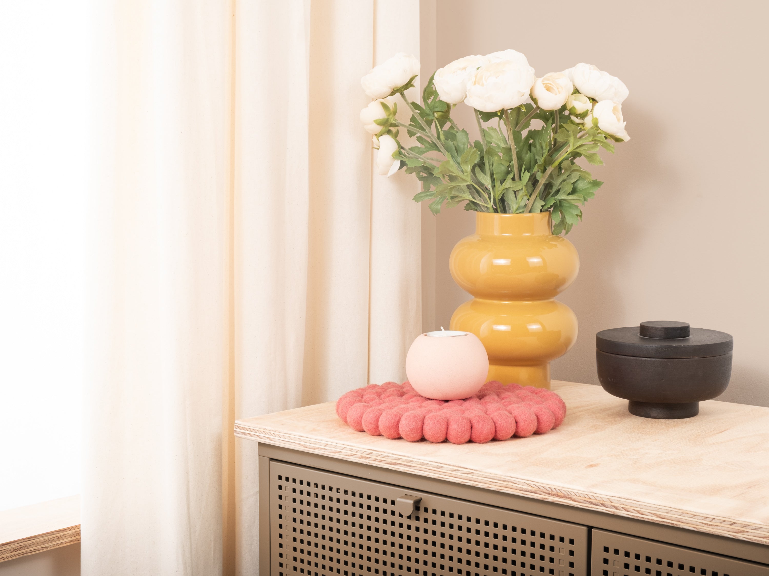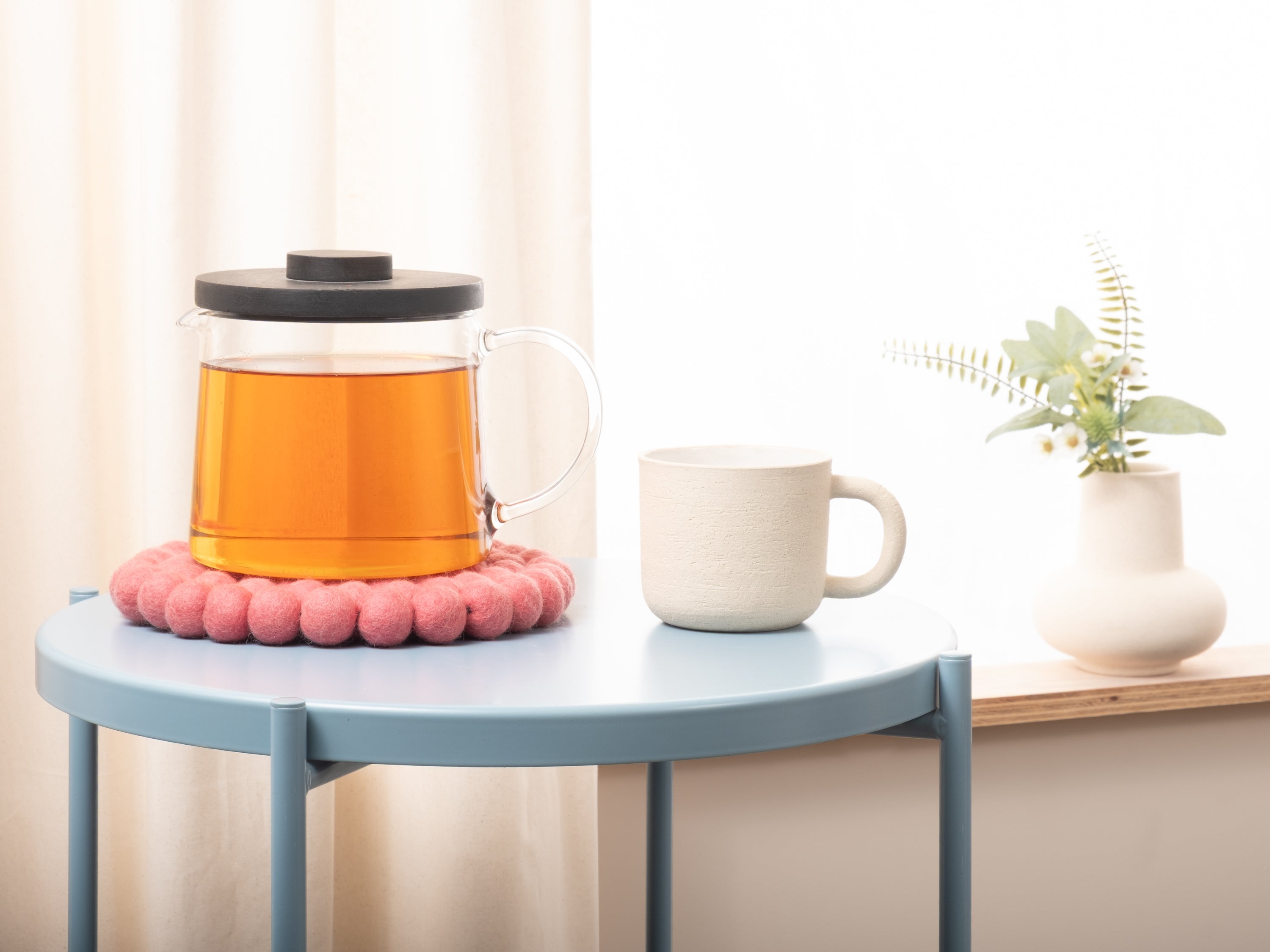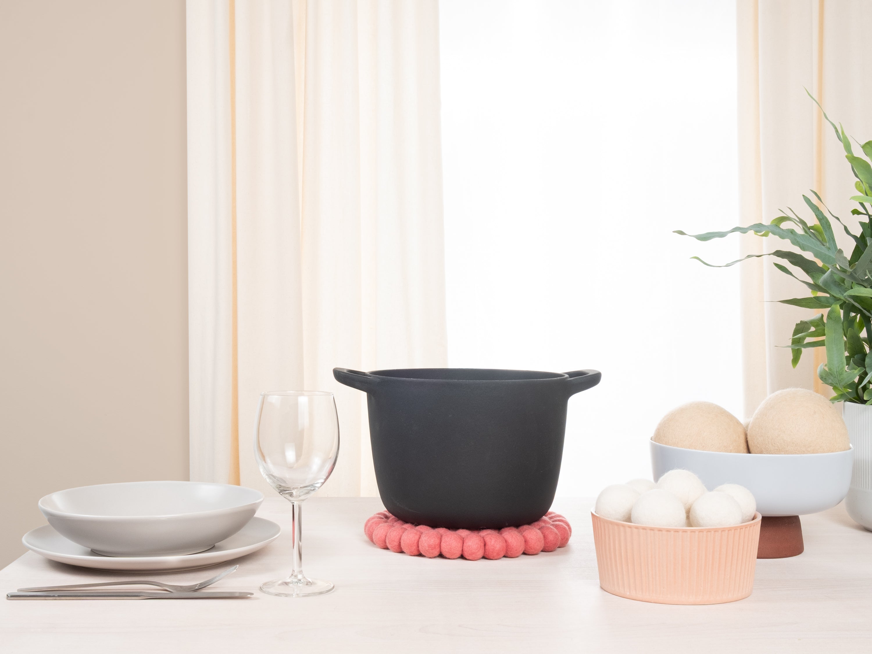 El salvamanteles Vera en el color rosa coral combina funcionalidad con un diseño encantador. Robusto, resistente al calor, repelente al agua y a la suciedad, y reversible. Fabricado con pura lana virgen, hecho a mano en Nepal y producido en condiciones justas.